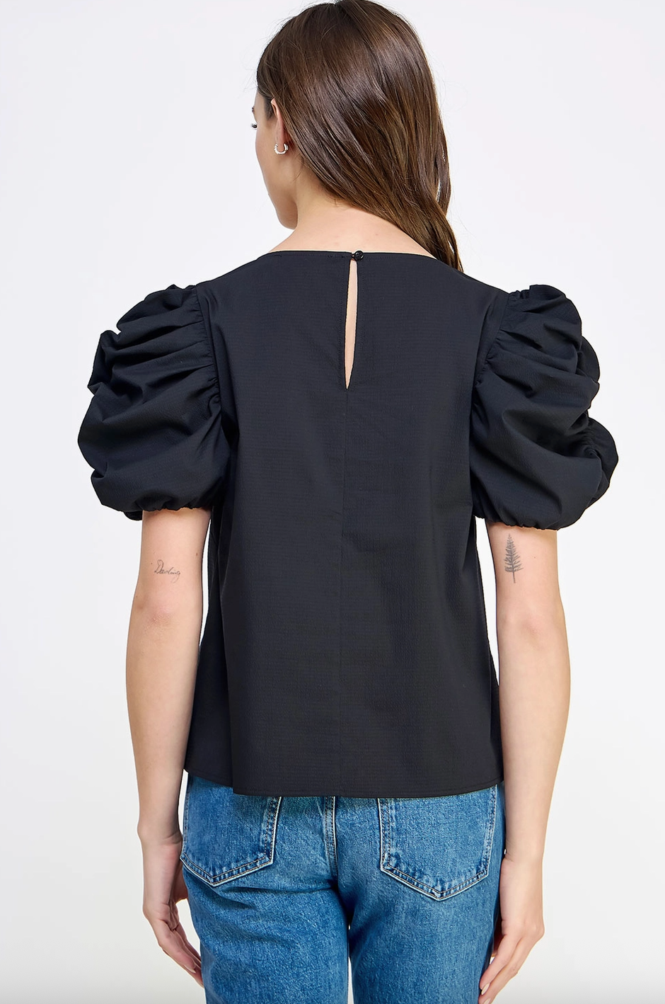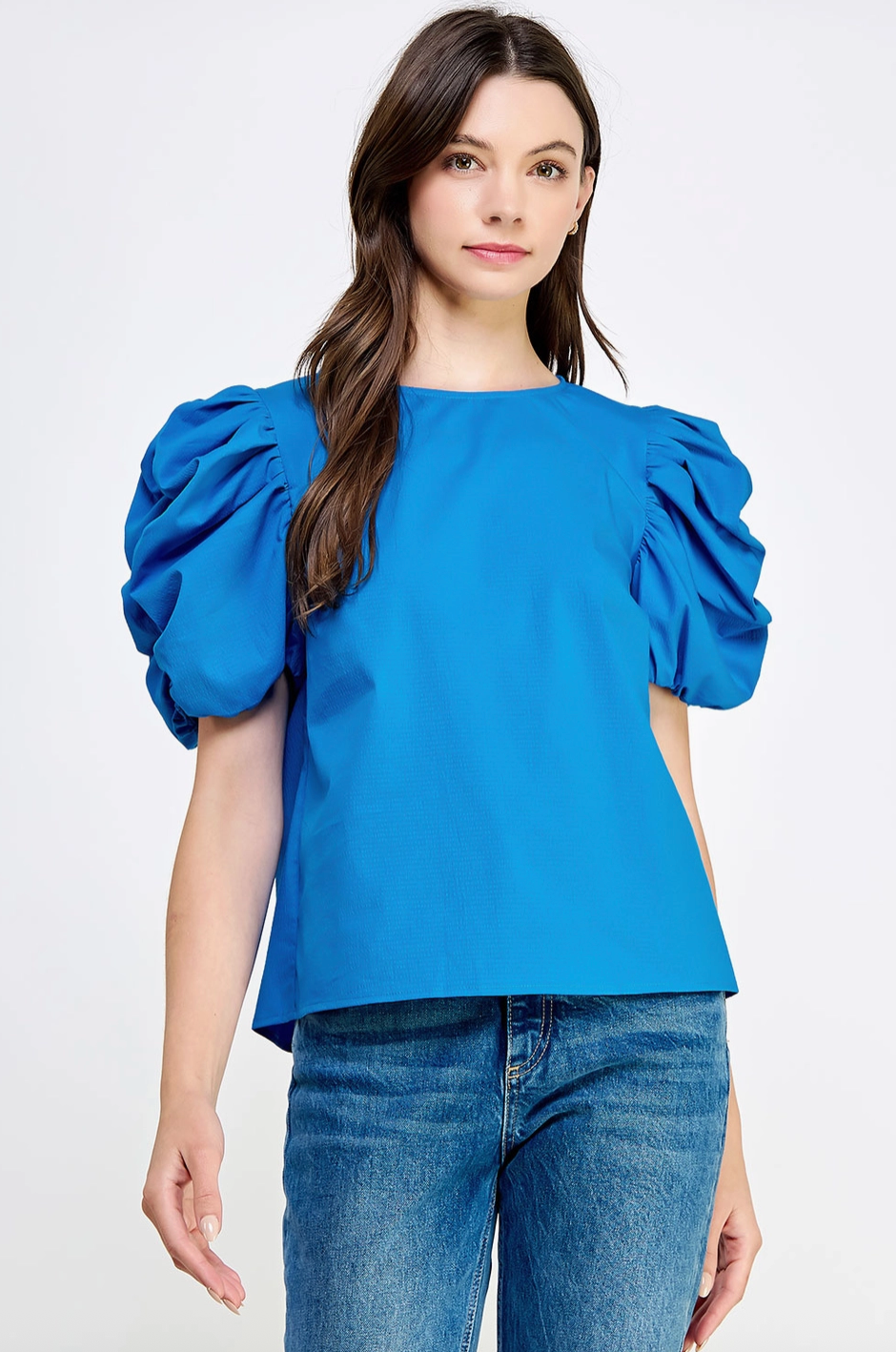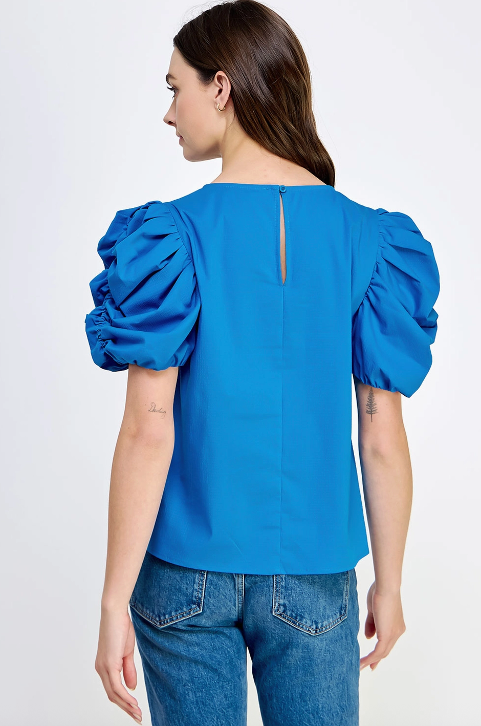 Elevate your wardrobe with The Arizona Top, crafted from stretch poplin for a comfortable, flattering fit. Its bold pleated puff sleeves and delicate ruching create a striking silhouette, while the round neck and keyhole button closure at the back add subtle sophistication. Perfect for making a statement wherever you go, this top effortlessly blends style and comfort.