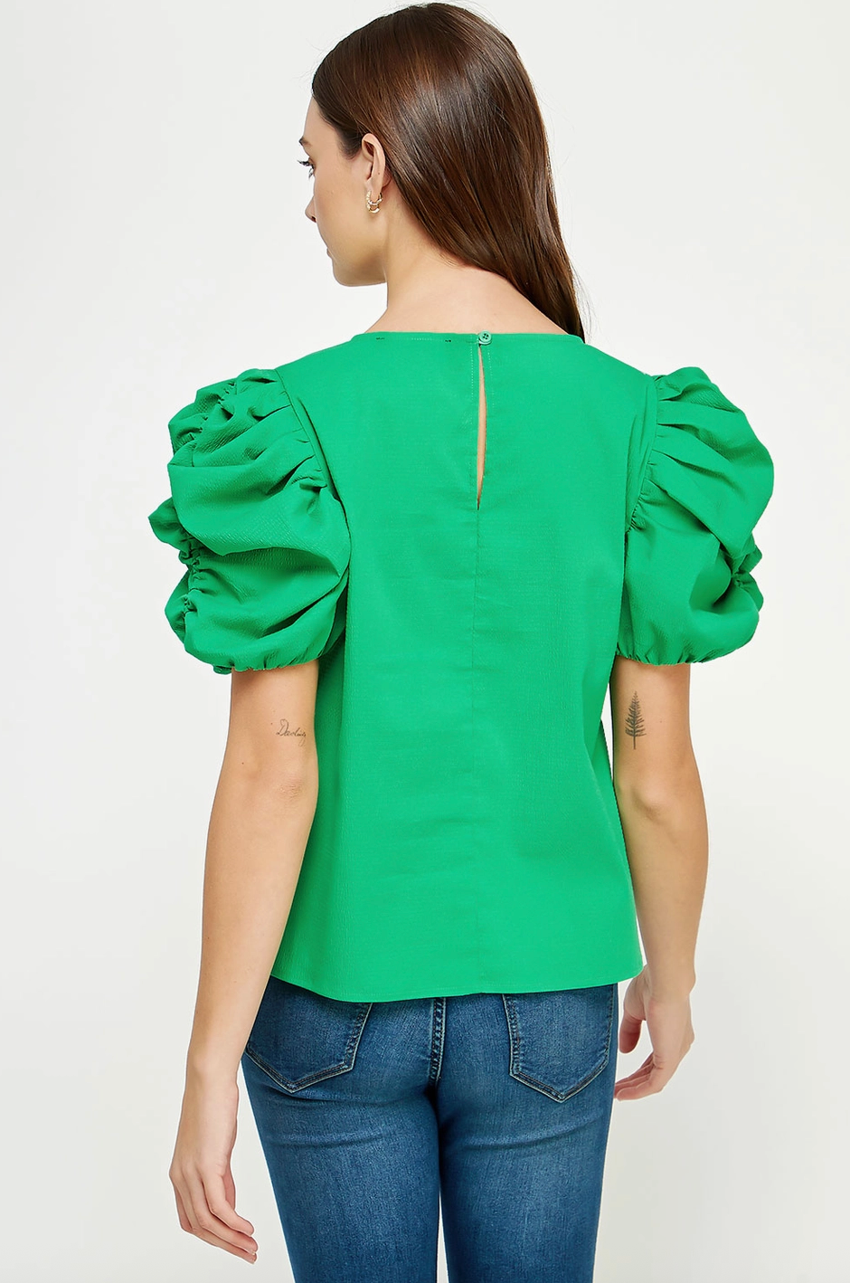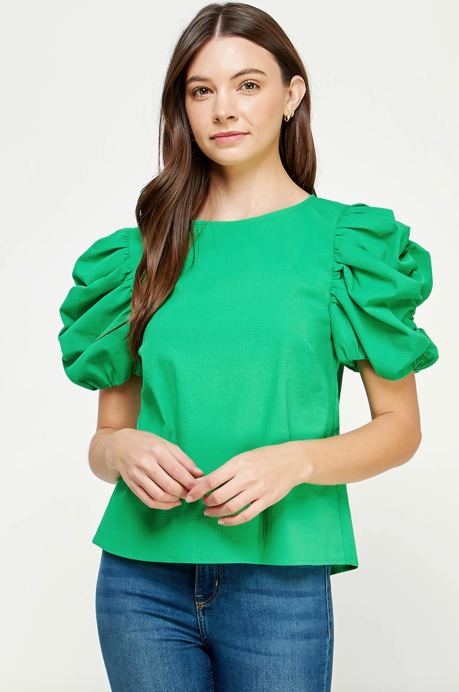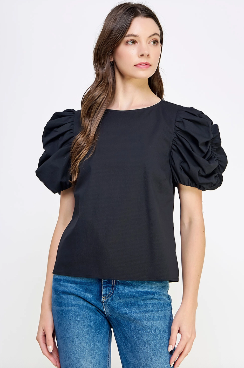 Elevate your wardrobe with The Arizona Top, crafted from stretch poplin for a comfortable, flattering fit. Its bold pleated puff sleeves and delicate ruching create a striking silhouette, while the round neck and keyhole button closure at the back add subtle sophistication. Perfect for making a statement wherever you go, this top effortlessly blends style and comfort.