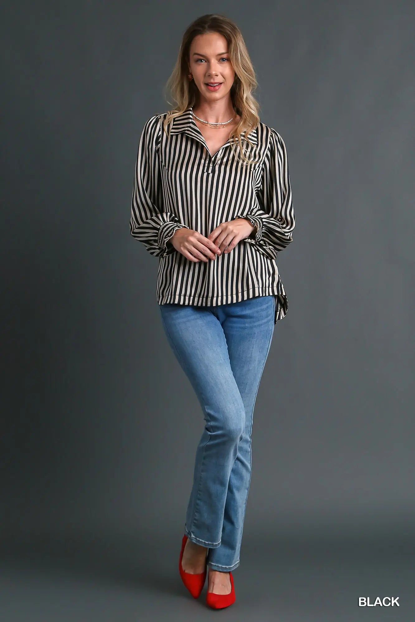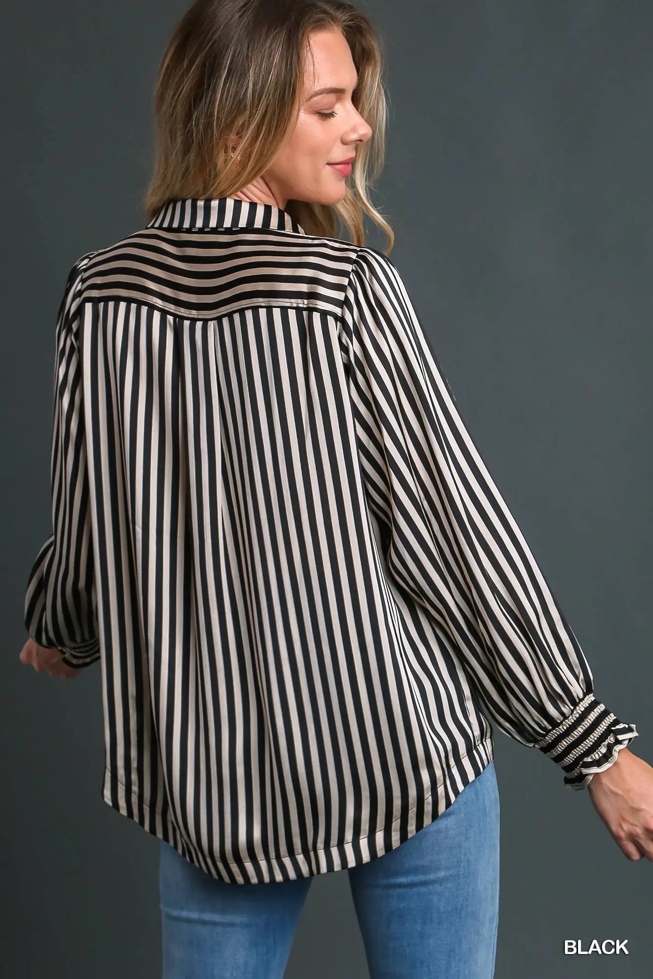 Elevate your wardrobe with The Carrie Top, featuring a luxurious satin stripe finish and a classic collared design. This versatile piece combines subtle sheen and timeless style, making it perfect for both workdays and weekend outings. Enjoy a polished look effortlessly, while the soft fabric ensures comfort all day long. Add The Carrie Top to your collection for a chic, confident statement every time you wear it.