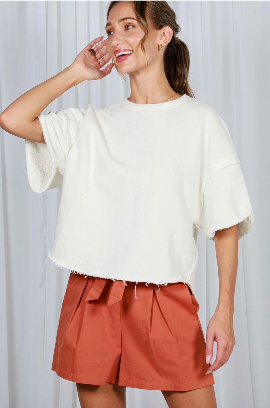 The Kacy Top combines comfort and style with its soft, relaxed fit and casual drop shoulders. Its short sleeves and cut edge crew neckline offer a vintage-inspired look, while the thoughtful back detail adds a unique touch. Designed to support your everyday comfort, this top is perfect for feeling good and looking great all day long.