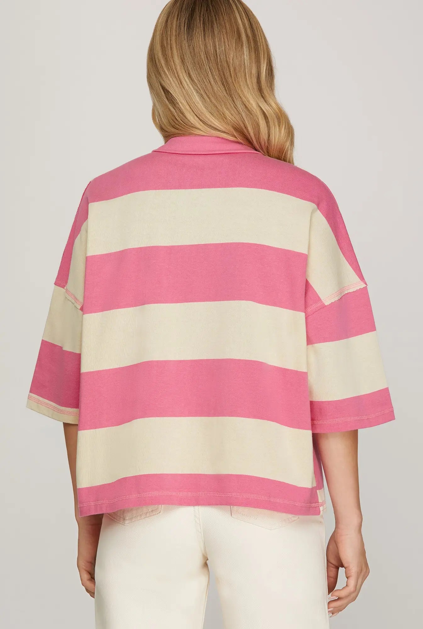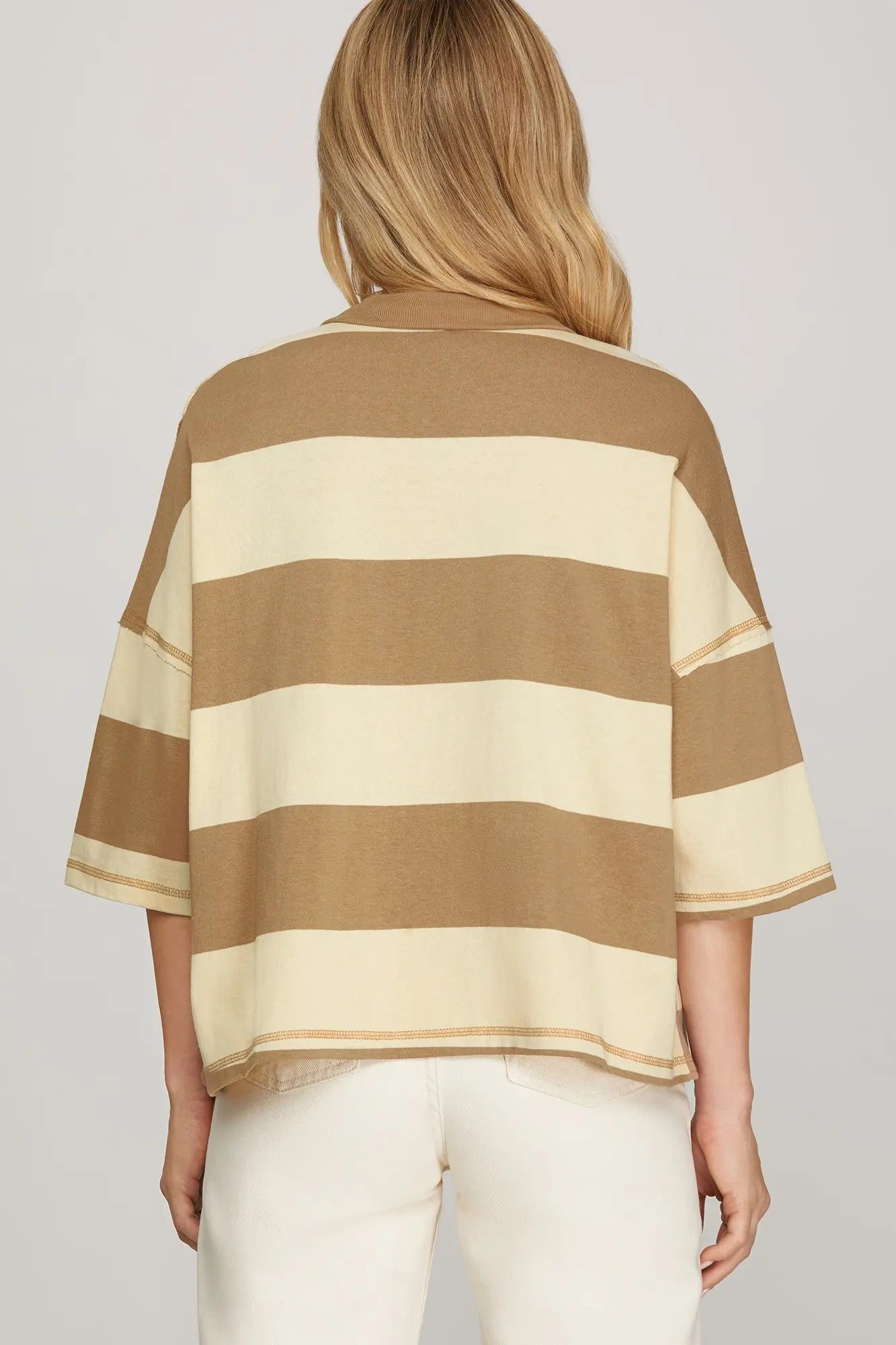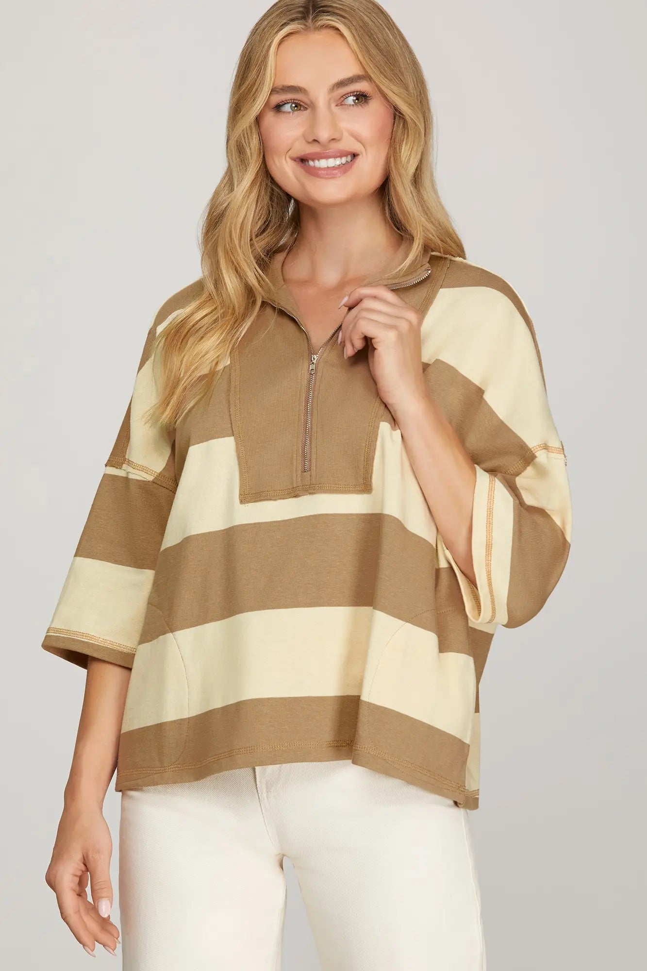 Introducing The Kayla Top—a laid-back essential with bold stripes and a convenient half-zip closure. The oversized fit and three-quarter sleeves create an effortlessly cool aesthetic. Whether you're running errands or relaxing at home, this knit top delivers comfort without compromising on style.