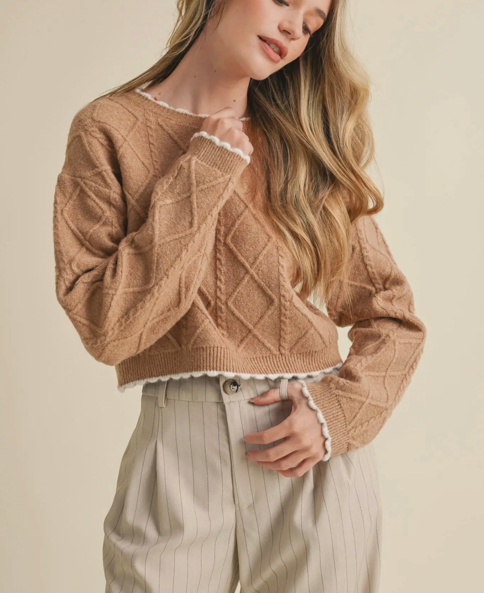 Meet your new go-to layer: The Mesa Sweater, a playful take on timeless cable knit style. Wrapped in buttery-soft fabric, this cropped wonder features whimsical scalloped trim framing the round neckline, cuffs, and hem. The relaxed drop shoulders and long sleeves offer cozy comfort without the bulk, while the cropped silhouette keeps things fresh and modern. Whether you're styling it with high-waisted bottoms or letting it peek out from an oversized jacket, the textured cable knit pattern adds dimension and charm to any outfit. Pure comfort meets personality.