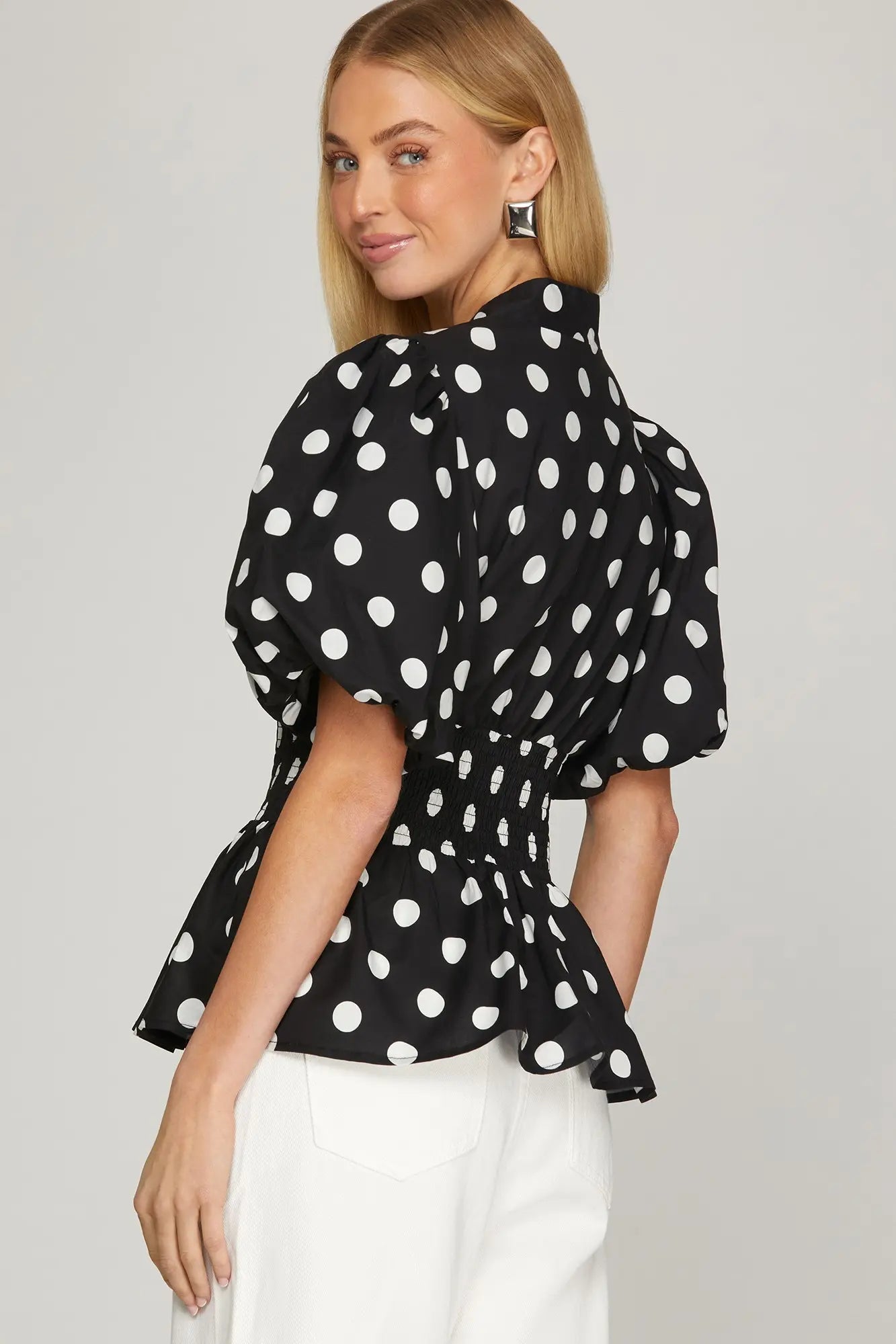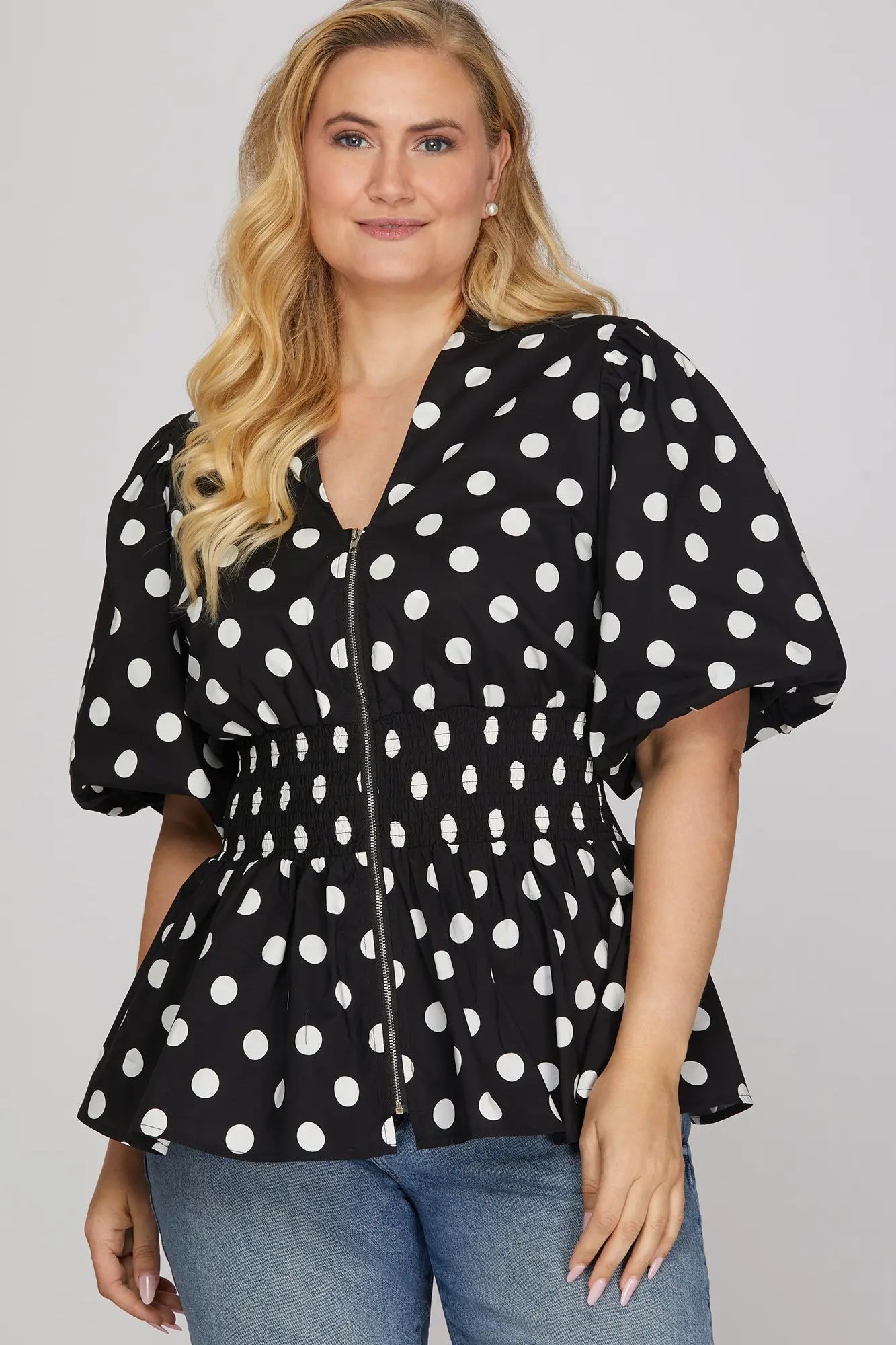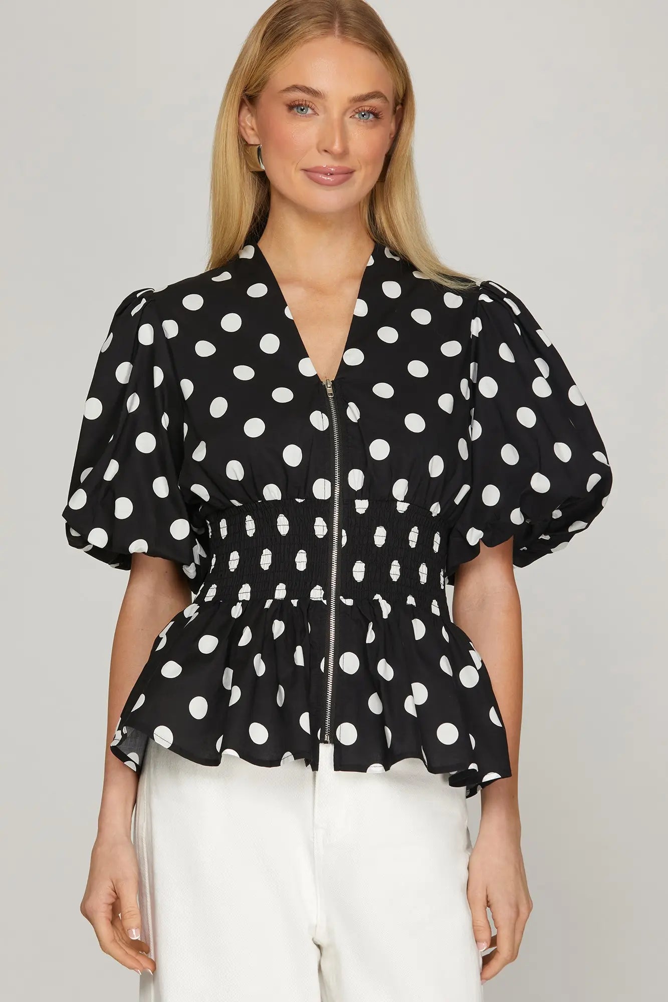 The Morgan Top features charming puff sleeves and a flattering waist smocking detail that creates beautiful definition. The front zipper allows for easy layering and adjustable coverage, while the woven polka dot pattern adds a playful, timeless touch. Perfect for casual outings or dressing up with your favorite pieces, this versatile top combines comfort with effortless style.