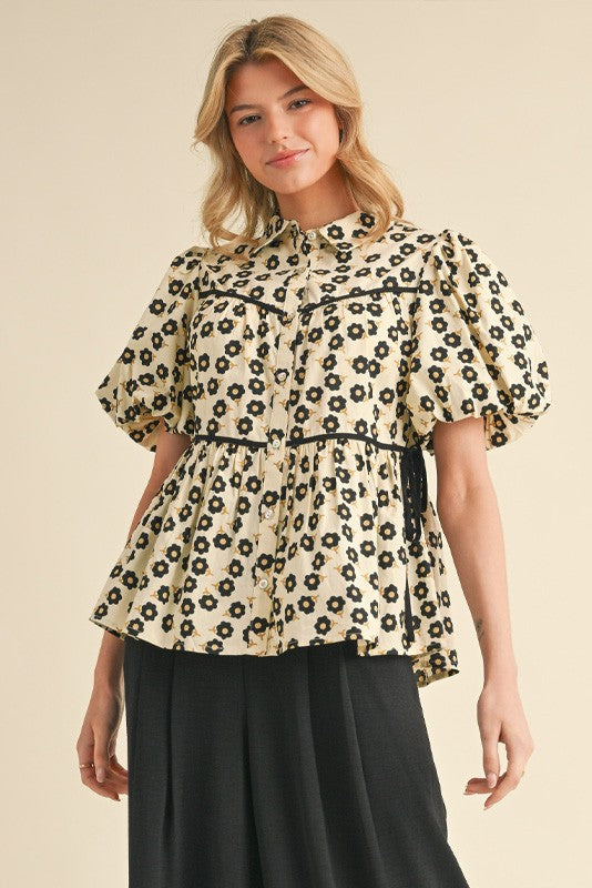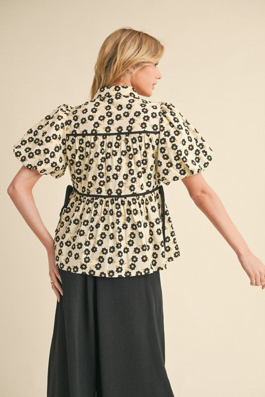 The Ophelia Top combines timeless floral elegance with modern details for a fresh, feminine look. Its collared neck and front button closure offer classic structure, while the puffed short sleeves add a soft, stylish touch. Color trimming and a delicate tie finish complete this versatile piece, making it perfect for dressing up or down with ease. Elevate your wardrobe with a top that blends charm and sophistication effortlessly.