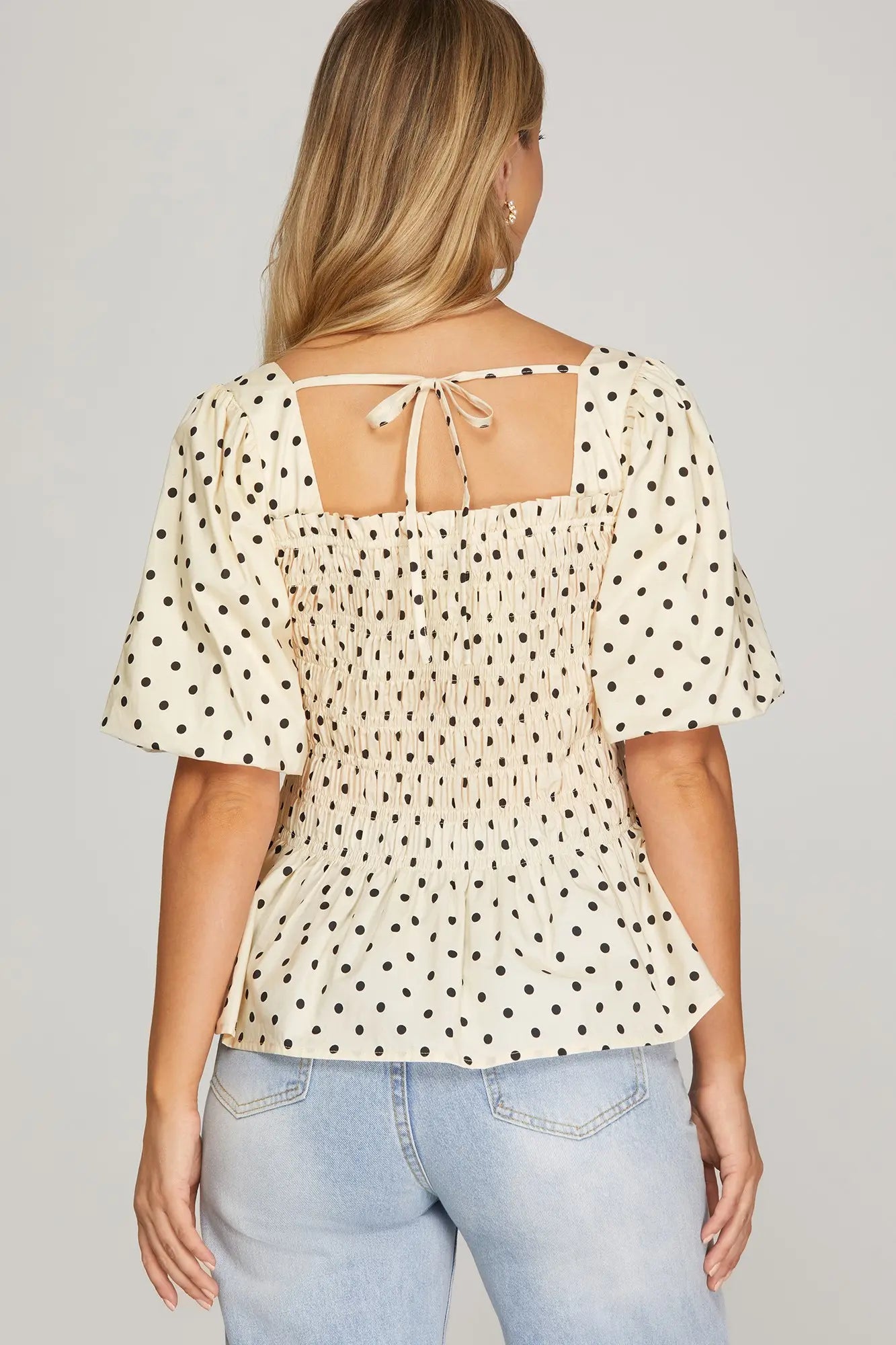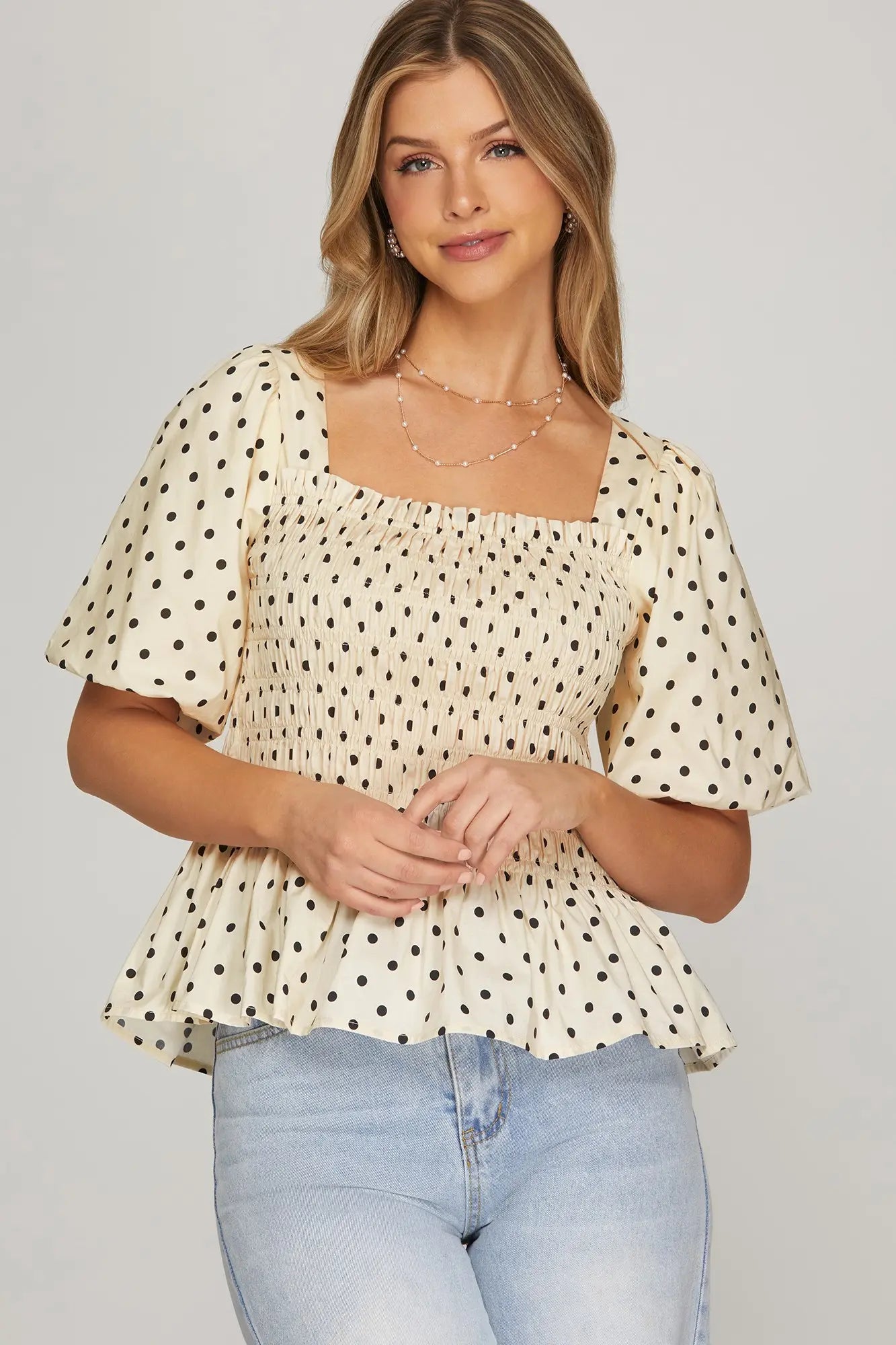 The Sophia Top features charming puff half sleeves and a playful polka dot pattern in a lightweight woven fabric. The smocked bodice creates flattering definition at the waist, while the peplum hem adds a feminine silhouette. Perfect for casual outings or dressing up with your favorite bottoms, this versatile piece brings effortless style to any wardrobe.