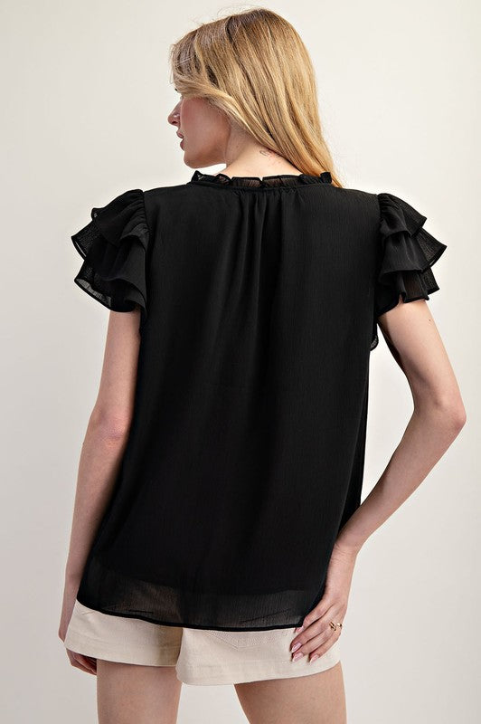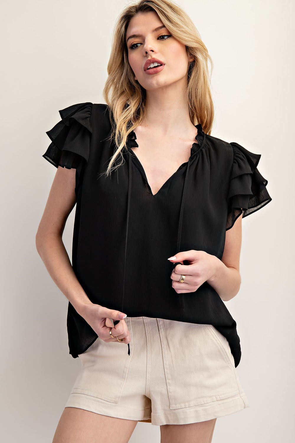 The Evelyn Top offers a comfortable, loose fit designed to suit all ages with ease. Its soft, relaxed silhouette provides freedom of movement, while the ruffle V-neckline and front tie closure add a gentle, flattering touch. The layered ruffle sleeves bring a subtle elegance, making this blouse a supportive choice for anyone seeking both style and comfort.